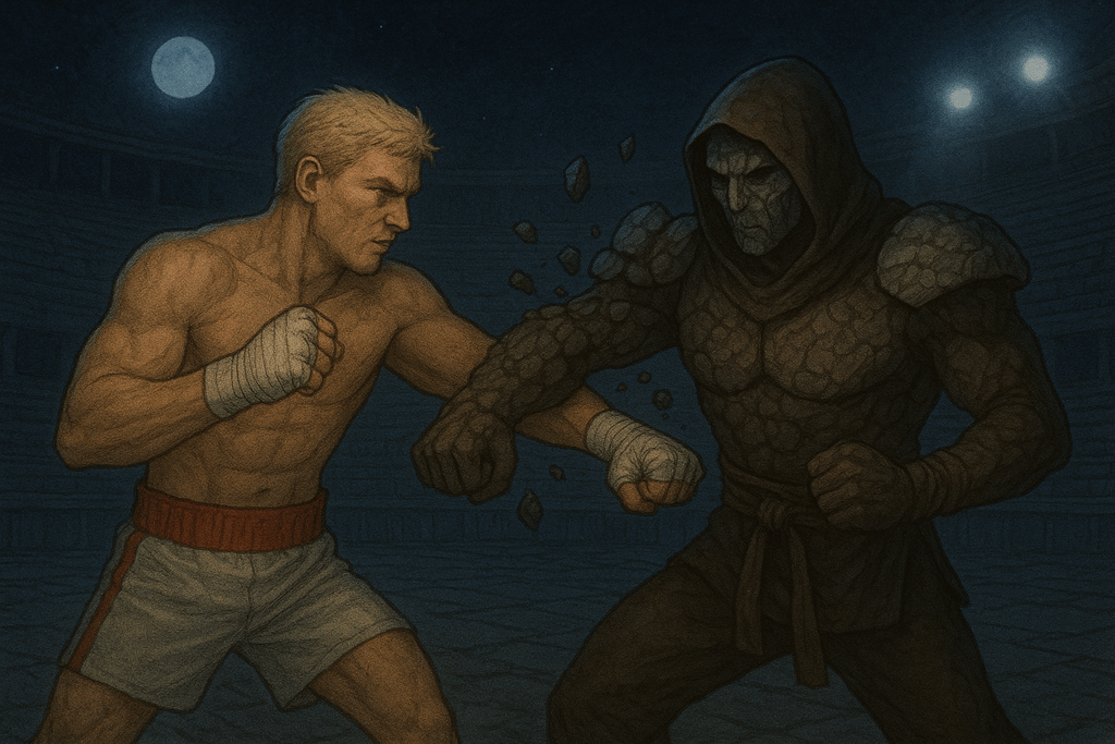 Drago não tem muito tempo para pensar pois o ninja elemental da terra parte pra cima dele com porretes de pedra, rochas arremessadas, abalos sísmicos e todo tipo de feitiçaria que o jovem leiteiro jamais imaginou que veria quando decididiu sair pela primeira vez da sua cidade há poucos meses. Drago acerta seus poderosos socos com toda sua força, mas o corpo do seu oponente parece não se abalar, apenas saltando lascas eventualmente mas sem o rosto petrificado exibir qualquer sinal de dor. A batalha vai avançando e as buracos abertos por Tremor com seus poderes vão destruindo a arena que, em algumas horas, seria usada como palco para as semi-finais.