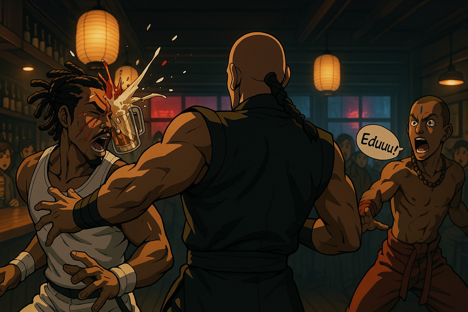 Edu sem entender nada pede satisfação do atacante, que diz para os gaijins darem o fora do seu bar e então começa um combate entre os dois, já que Edu recusa se retirar. Depois de uma rápida trocação, Edu consegue acertar em cheio seu oponente com um chute rodado jogando o oponente contra uma mesa que quebra no impacto, deixando o mesmo desnorteado.