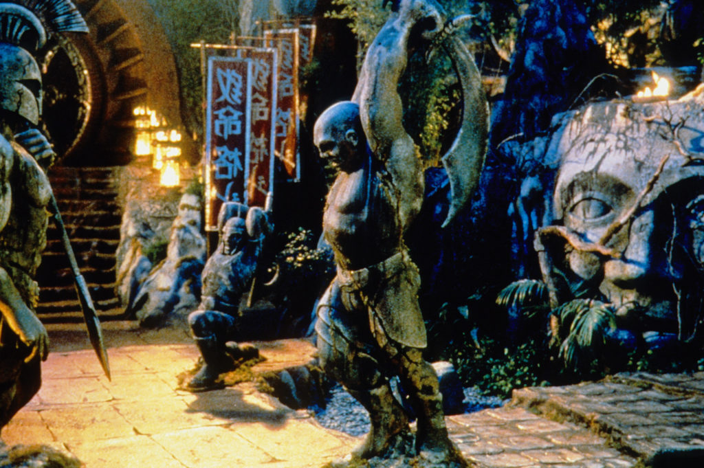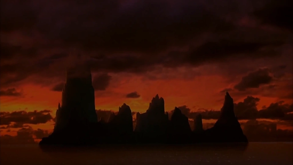 Aos poucos o amanhecer vai chegando e o seu destino também: uma paradisíaca ilha no Pacífico com praia, florestas de palmeiras e uma enorme montanha ao centro, como se esculpida de maneira diabólica para ser também uma fortaleza. Do barco à vela que fica âncorado em alto-mar, eles são conduzidos em botes com ninjas remando até a praia, onde desembarcam, a maioria com a roupa do corpo ou apenas uma mochila, mas Johnny cheio de malas, para surpresa de todos. Eles caminham por uma trilha na floresta e podem observar uma arena rústica no caminho, com chão de areia e demarcada por pedras e bandeiras, onde será o palco das lutas no dia seguinte. Quando se aproximam da montanha/fortaleza, é possível ver esculturas e estátuas tenebrosas, de guerreiros de armadura lutando em agonia, monstros atrozes portando armas e diversos símbolos de uma espécie de ocultismo extraterrestre, possivelmente do mundo ao qual o feiticeiro serve: a Exoterra.