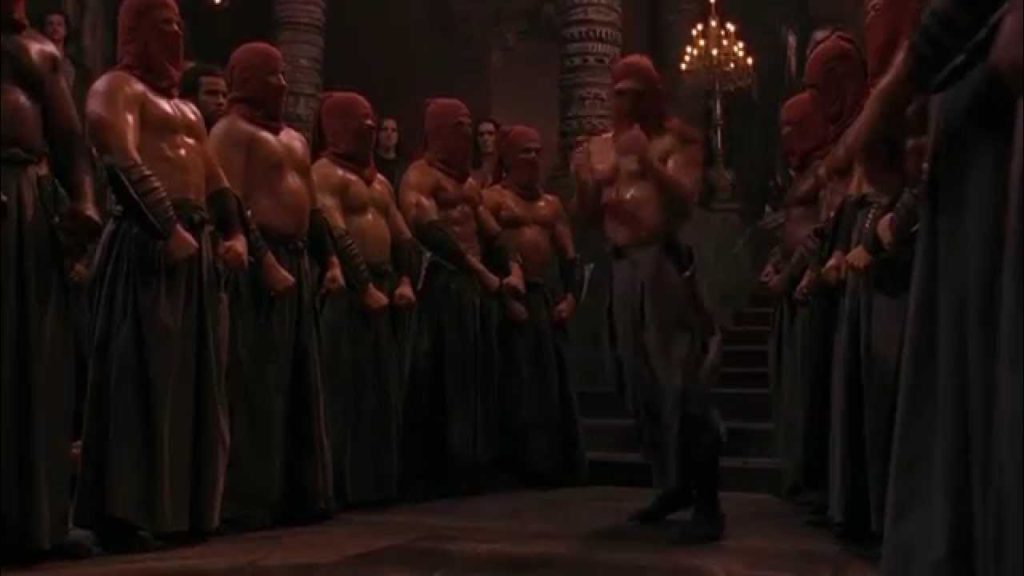 Enquanto alguns se impressionam, Cage zomba, afirmando que já viu fantasias melhores e que tudo aquilo ali não deve passar de uma encenação para intimidá-los, mas que não funcionaria com ele. Shang Tsung pede licença à realeza e os deixa para tratar de assuntos pessoais. Kano fica ainda mais grosseiro com a saída de seu chefe, garganteando que com Goro a seu lado, são invencíveis. Nisso, Raj por uma caso percebe algo estranho: uma sombra mal projetada na parede, como se um ser invisível estivesse se escondendo atrás dos candelabros, próximo às princesas. Ele comenta com Kiet, que decide avisar, chamando a atenção de Jade, guarda-costas delas. A moça saca o seu bastão longo rapidamente e parte para cima de Kiet, irritada pois já tinha avisado ele para nem mesmo dirigir a palavra à elas. O tailandês se desculpa e desvia do ataque, propositalmente lento e forte, que acaba acertando um grande frango assado que estava à frente deles, espalhando comida por todo lado e sujando todo o blazer novo que Johnny Cage estava usando nessa ocasião especial.