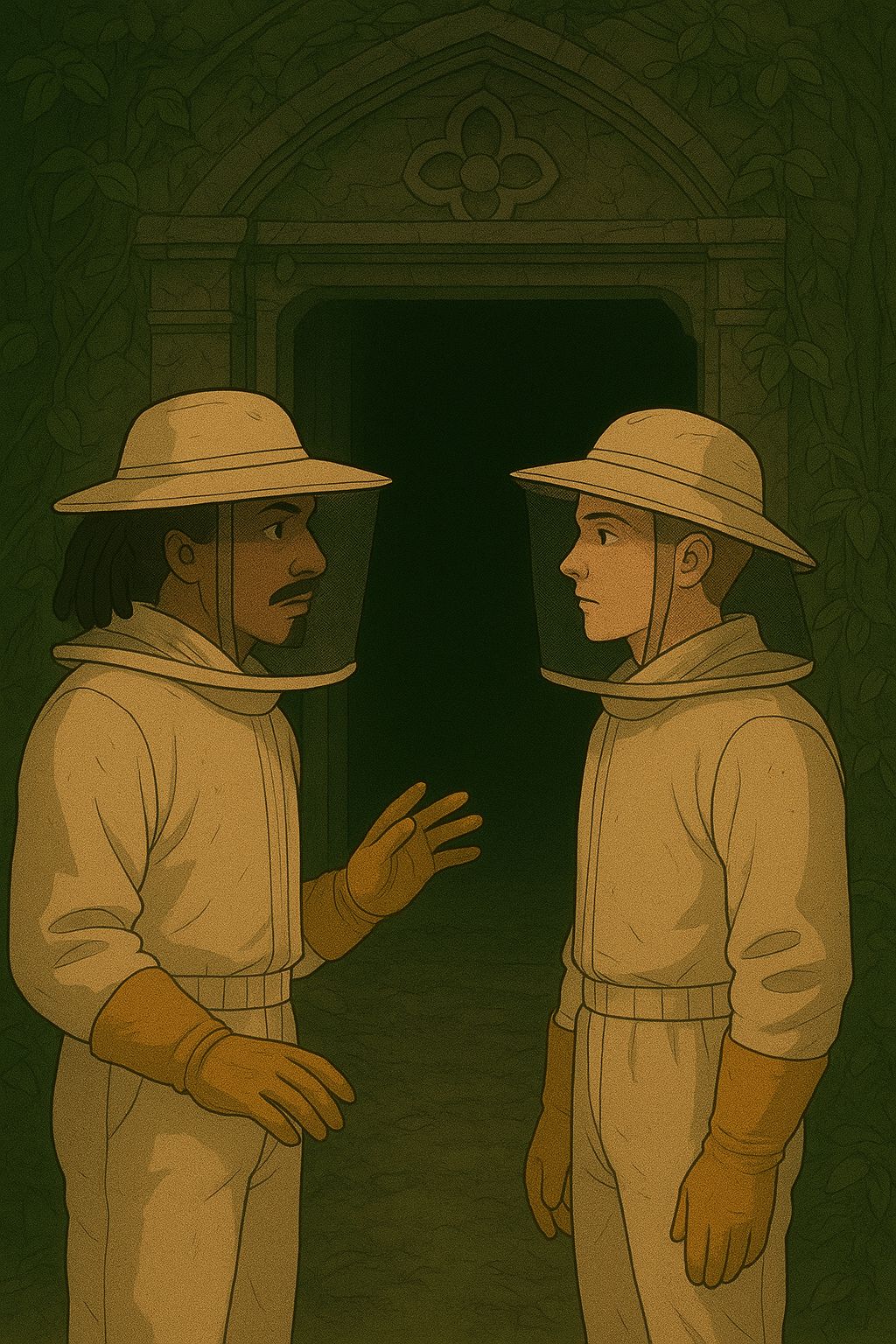 Eles descem mais um pouco e começam a sentir o cheiro forte de cadáveres em decomposição, misturados com cheiro de mofo e cogumelos. Ouvindo com atenção, também é possível notar a pulsação de algum insetóide imenso vivo lá dentro. Edu acende outra tocha e arremessa na câmara, para verem melhor e talvez ele dormisse melhor aquela noite se não tivesse feito isso. A imagem é assustadora: pilhas e pilhas de cadáveres e esqueletos, cobertos de besouros de sangue em uma sala que parece um antigo dormitório. Ovos de besouro pendurados pelas paredes e chão e uma imensa rainha besouro prostada ao fundo tapando uma última passagem. Ela é imensa e do seu abdômem são expelidos os ovos que mantém a colônia em constante crescimento. O muco tóxico que sai junto, aliado à escuridão e à umidade por estarem próximo à nascente da cachoeira da montanha cria o cenário perfeito para o surgimento de fungos enormes ao seu redor, as Flores de Sangue.